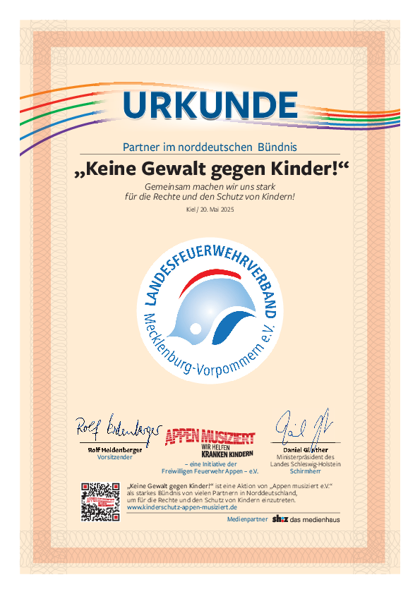 Gewalt gegen Kinder und Jugendliche ist ein Thema, dass einfach zu selten angesprochen wird und doch passiert es jeden Tag. Oft sind es diejenigen, denen Kinder eigentlich vertrauen sollten, die Ihnen Leid zufügen. Die seelischen und körperlichen Folgen sind tiefgreifend und hinterlassen Spuren, die ohne Hilfe kaum heilen können. Auch beim Thema Gewalt gegen Frauen sind Kinder häufig mitbetroffen – als stille Zeugen, die mitansehen müssen, wie ihre Mutter misshandelt, gedemütigt oder geschlagen wird. Die psychischen Wunden, die dabei entstehen, sind tief – und heilen oft nur langsam oder gar nicht. Die stetig steigenden Zahlen häuslicher Gewalt zeigen: Unsere Kinder und Jugendlichen befinden sich in einer dramatischen Lage. Deshalb ist es uns als Landesfeuerwehrverband Mecklenburg-Vorpommern, ein besonderes Anliegen, uns aktiv für den Schutz von Kindern und Jugendlichen einzusetzen. Mit unserer Unterstützung des Vereins „Appen musiziert e.V.“ möchten wir gemeinsam mit über 140 Partnern in Norddeutschland ein deutliches Zeichen setzen: Gegen Gewalt - für Hoffnung - für starke Kinderseelen!